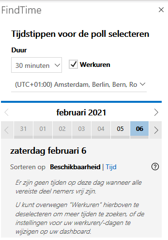Als je in de aanhef bij aan een aantal namen typt krijg je in Find time een overzicht van wie, wanneer beschikbaar is. Je kunt de beste opties selecteren en die aan de anderen voorleggen.