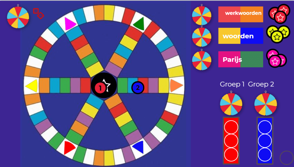 Iedere categorie heeft 2 kleuren op het speelveld een 1 wiel waar op je kunt klikken om de vraag te zien.