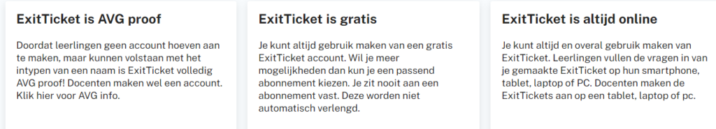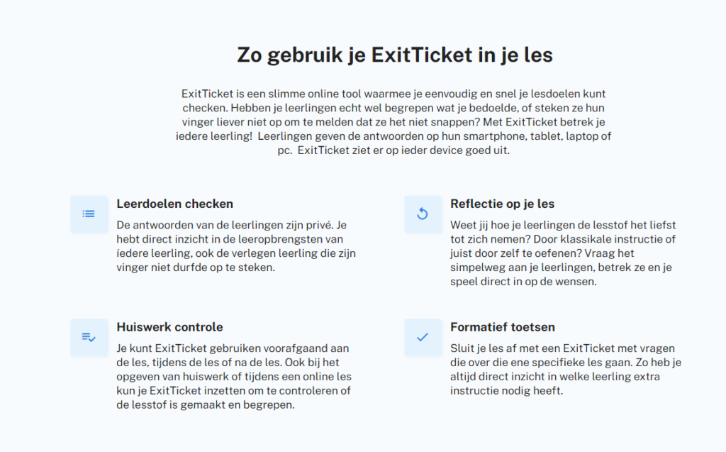 Op exittickets kun je heel eenvoudig exit-tickets maken om een korte peiling onder de leerlingen te houden. Je houdt hierdoor overzicht over wie nog dingen moet herhalen en wie er behoefte heeft aan verder werken. Je kunt dus vrij eenvoudig differentiëren zonder dat het heel veel tijd kost. De antwoorden van de leerlingen worden alleen voor de docent zichtbaar. Je kunt een exit ticket op ieder moment van de les inzetten.
