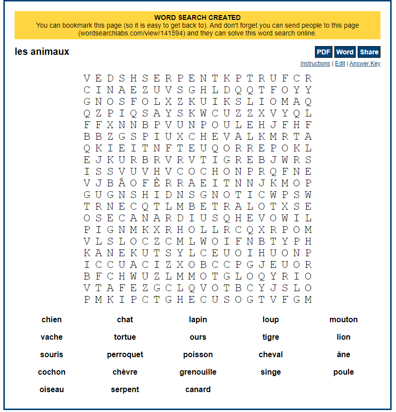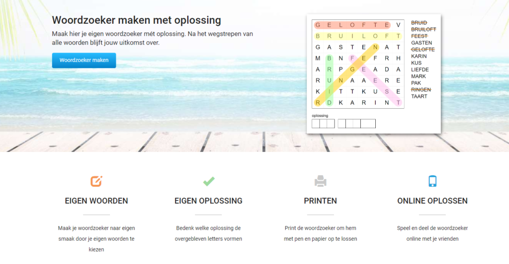 Op de site van wordsearchlab kun je een woordzoeker maken met begrippen of woorden. Je hoeft ze alleen maar in te voeren met een komma ertussen en voilà, een heel eenvoudige en snelle manier om een woordzoeker te maken.