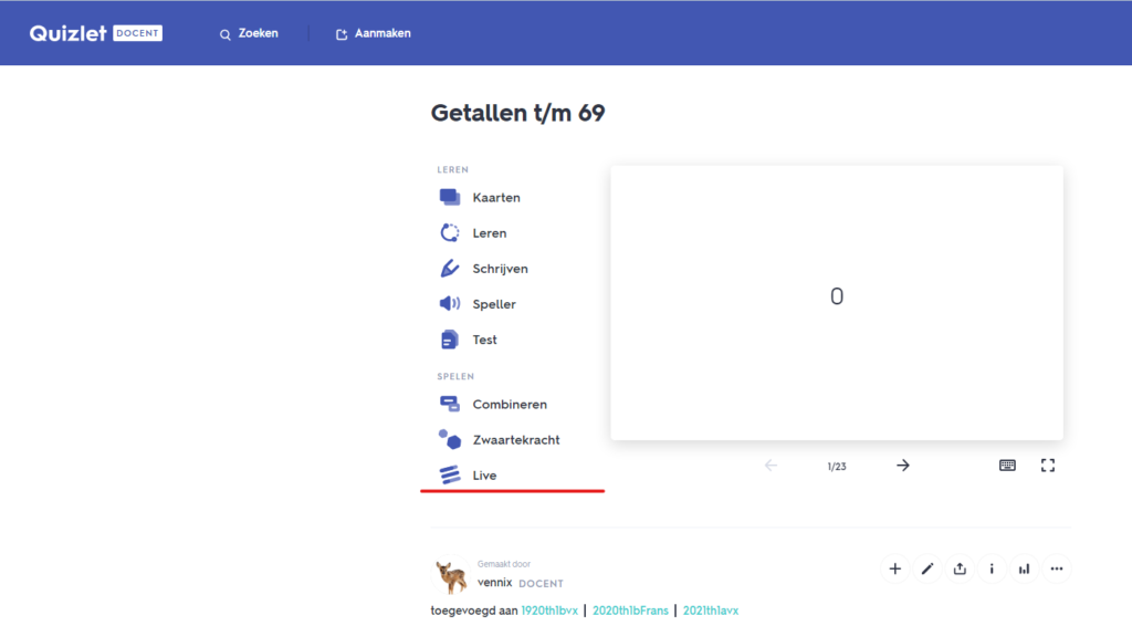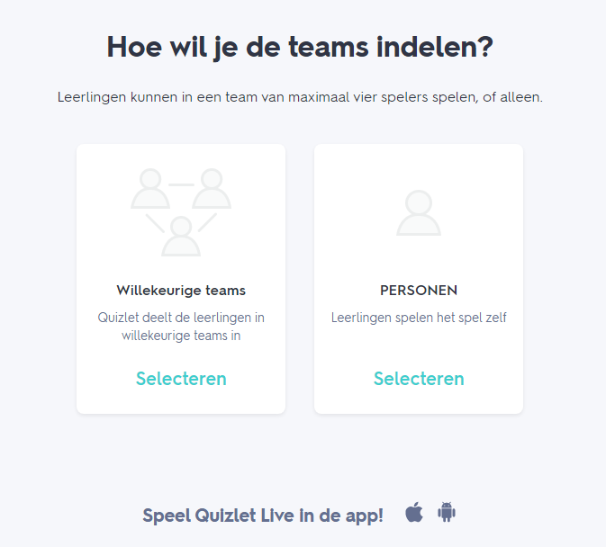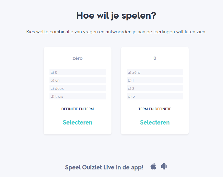 Je speelt met de bestaande sets die je op www.quizlet.com hebt aangemaakt. Je kunt kiezen uit 2 varianten.