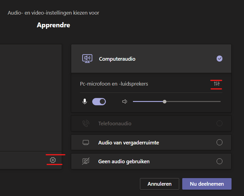 Het komt soms voor dat leerlingen elkaar of de docent niet kunnen verstaan. Het is dan belangrijk om de apparaat instellingen te checken. De apparaat instellingen kom je op verschillende plaatsen tegen in Teams. Je kunt dit dus vooraf aan de vergadering doen maar ook tijdens je vergadering.