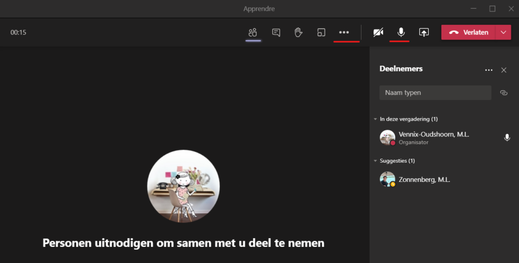 Tijdens de vergadering kun je de microfoon altijd dempen door op de microfoon in de vergaderbalk te klikken. De anderen zullen je dan niet meer horen.