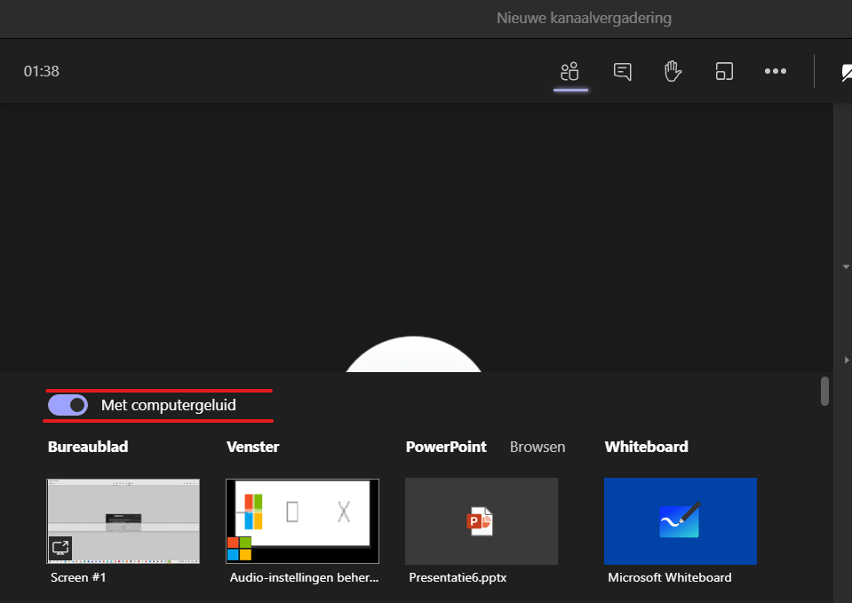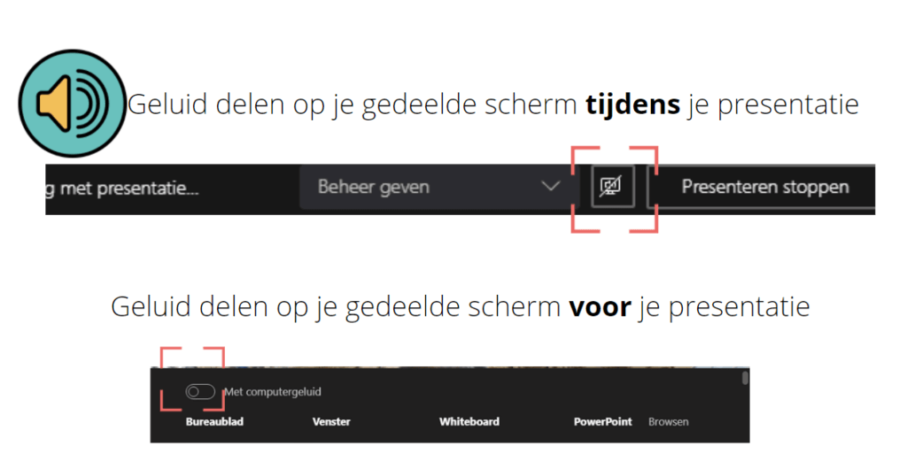 Als je een filmpje wil laten zien tijdens de online-les dan is het noodzakelijk om ook het computergeluid mee te delen.