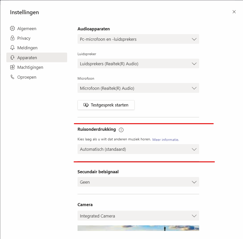 In het menu staat apparaat instellingen en hier kun je de instellingen van de microfoon, luidspreker en camera aanpassen.