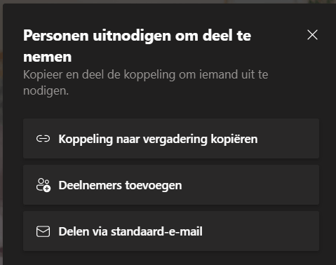 Met deze optie heb je de mogelijkheid om mensen naar je vergadering toe te halen door op deelnemers toevoegen te klikken en de optie om je vergadering naar mensen toe te brengen door de optie van de koppeling en de e-mail.